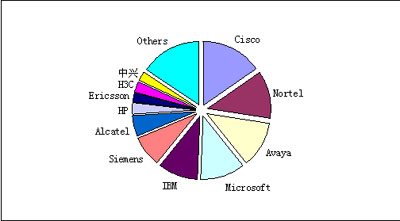 各大通信與IT廠商都在厲兵秣馬,充分挖掘企業(yè)的自身優(yōu)勢(shì),準(zhǔn)備在潛力巨大的統(tǒng)一通信市場(chǎng)中取得良好戰(zhàn)績(jī)。賽迪顧問(wèn)數(shù)據(jù)顯示,2008年上半年,中國(guó)統(tǒng)一通信市場(chǎng)中,Cisco公司以15.3%的市場(chǎng)份額繼續(xù)保持領(lǐng)頭樣的位置,在通信設(shè)備領(lǐng)域,Nortel和Avaya分別以12.1%和11.7%的市場(chǎng)份額緊隨其后。值得一提的是Microsoft和IBM以其在全球獨(dú)一無(wú)二的終端用戶(hù),迅速占領(lǐng)統(tǒng)一通信軟件市場(chǎng),無(wú)論是市場(chǎng)份額還是整體競(jìng)爭(zhēng)力都成績(jī)不俗,且增長(zhǎng)勢(shì)頭強(qiáng)勁。各大廠商短時(shí)間的涌入,使得統(tǒng)一通信市場(chǎng)出現(xiàn)了前所未有的群雄逐鹿的局面,競(jìng)爭(zhēng)異常激烈。