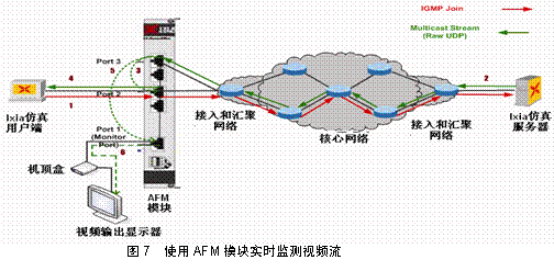 另外一種常見的應(yīng)用場景是對網(wǎng)絡(luò)中存在的IPTV組播流和單播流能夠進行被動實時監(jiān)測并能夠評估相應(yīng)視頻流的視頻質(zhì)量。IXIA獨特的視頻流提取模塊AFM支持該特性的測試(見圖6)。