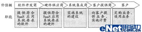 在傳統(tǒng)的軟件開發(fā)模式下,客戶建設(shè)IT系統(tǒng)需要直接面對軟件開發(fā)商、硬件提供商、集成商和售后技術(shù)支持,系統(tǒng)建設(shè)周期長、初期投入大。在SaaS模式下,客戶只需要與服務(wù)提供商發(fā)生關(guān)聯(lián),在向服務(wù)提供商定購業(yè)務(wù)后,客戶無需關(guān)注系統(tǒng)的軟件和硬件,可以直接使用業(yè)務(wù)。從客戶角度,從傳統(tǒng)模式發(fā)展到SaaS模式,價值鏈由并行轉(zhuǎn)變?yōu)榇。從ASP模式發(fā)展到SaaS模式,則出現(xiàn)了新的價值鏈角色服務(wù)提供商。SaaS模式下價值鏈的組成如圖3所示。