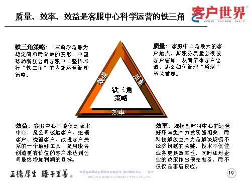 應(yīng)該說這三個方面是科學(xué)運營的一個鐵三角,這是我們的理解,因為三角形,始終認為是最穩(wěn)定、簡單、有效的圖形,也是我們在進行內(nèi)部運營的管理鐵架。質(zhì)量是客服中心最大的觸點當(dāng)中被客戶感知,從而帶來客戶忠誠的,如何管理質(zhì)量,那就至關(guān)重要。效率尤其是規(guī)模型的呼叫中心的運營好壞,是與生產(chǎn)力的發(fā)展強相關(guān),而科技解放生產(chǎn)力是解決規(guī)模問題的關(guān)鍵。技術(shù)不僅是運行更具效益率,同時還對企業(yè)的決策作出預(yù)先準(zhǔn)備,而不僅僅是事后反應(yīng)。很多年來,更多的企業(yè)是把客服中心視為成本中心,而事實上,效益的顯現(xiàn)讓我們陸續(xù)地走出了成本中心,它應(yīng)該是公司接觸客戶、挖掘客戶、挽留客戶、改進客戶關(guān)系的一個最好工具,是用服務(wù)創(chuàng)造更有價值的客戶,來達到公司最終增加利潤的目標(biāo)。