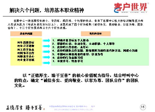 一線客服人員如何來全面提升職業(yè)能力,首先是解決一線客服人員的六個問題,剛才已經(jīng)跟大家交流了客服中心一線人員的人員結(jié)構(gòu),當(dāng)前的六個主要問題可以用簡單的幾個方面來表述:對生活沒有明確的目標(biāo)、對自己不進取、對工作不負責(zé)、對同事不合作、對顧客不關(guān)心、對企業(yè)不忠誠,這是在日常工作中,一線人員所存在的問題。而針對這些問題,我們要用工作目標(biāo)去持續(xù)解決和克服問題,所以我們采取的是讓大家明確企業(yè)目標(biāo)與個人使命,用積極的心態(tài)自主自發(fā),主動積極和個人領(lǐng)導(dǎo);良好的工作態(tài)度責(zé)任心,良好的團隊合作氛圍;熟練掌握溝通技巧和方法,牢固樹立顧客滿意的意識,以客為尊;良好的行為素質(zhì)習(xí)慣,自我學(xué)習(xí),終身學(xué)習(xí)。從而在中國移動集團“正德厚生、臻于至善”的核心價值觀指導(dǎo)下,結(jié)合呼叫中心特點,確定誠實務(wù)信,愛崗敬業(yè),以客為尊、團隊合作的團隊文化。