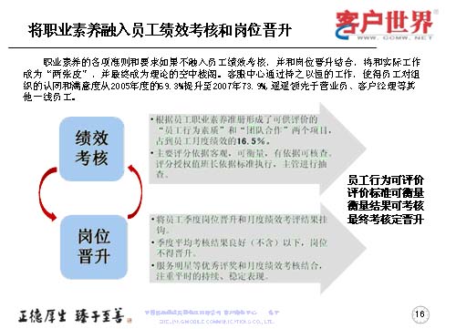 職業(yè)素養(yǎng)不是說在嘴上,講在課上,而是更多地融入到員工的績效考核于崗位晉升當(dāng)中。以解決工作素養(yǎng)要求和實際工作的兩張皮,以及使得客服理念成為理論的空中樓閣。所以我們是持之以恒地開展一線員工組織認同滿意度調(diào)查,我們每年都會做一線客服人員的滿意度調(diào)查,在滿意度調(diào)查當(dāng)中,從05年的69.3%,提升到07年的73.9%,而且遙遙領(lǐng)先于營業(yè)員和客服經(jīng)理。而在績效考核中主要把員工行為素質(zhì)、團隊合作占到了員工月度績效的16.5%,使大家認識到作為一個組織中的一員,作為團隊我們是為了一個共同的目標(biāo),彼此依賴、彼此信任,同時也要強化績效來管理。所以主要的評分依據(jù)是客觀、可衡量、有依據(jù)可查,同時也把這些也作為客服人員季度晉升和月度績效考評掛鉤,如果該員工季度的平均考核在良好以下的話,將得不到晉升,最終實現(xiàn)的是員工行為可評價,評價標(biāo)準(zhǔn)可衡量,衡量結(jié)果可考核,最終考核定晉升。