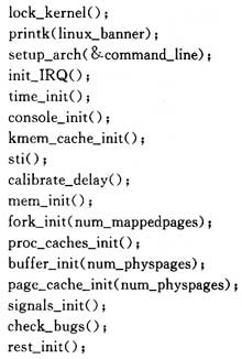 在系統(tǒng)啟動(dòng)后,最先調(diào)用的是針對(duì)32位微處理器MCF5249的特定的arch文件夾內(nèi)mmcontr.S文件。最后跳到main.c中的start_kernel()。μClinux/Linux-2.4.X/init/main.c中包含了對(duì)Linux系統(tǒng)初始化的代碼。其中stan_kernel()包含主要的初始化代碼。