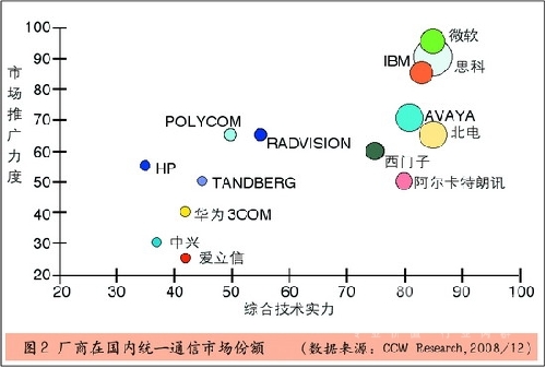 從當(dāng)前國(guó)內(nèi)統(tǒng)一通信市場(chǎng)競(jìng)爭(zhēng)格局來(lái)看,在綜合技術(shù)實(shí)力方面,根據(jù)廠(chǎng)商所提供的統(tǒng)一通信解決方案中所能夠提供的各種溝通方式融合的程度以及每個(gè)具體功能技術(shù)水平等綜合因素考慮,處于前幾位的分別是思科、微軟、北電、IBM和Avaya,它們的產(chǎn)品線(xiàn)比較長(zhǎng),產(chǎn)品功能也相對(duì)比較全面。