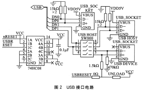 在ARM9開發(fā)板內部含有1個USB2.O接口控制器,接口電路如圖2所示。共有3個LISB接口(2個Host和1個Device),通過選擇開關SW800進行選通控制。74HC08作為4個二輸入與門邏輯電路,負責控制信號的邏輯組合。該接口用來連接USB接口的外部設備。