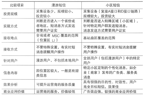 兩個系統(tǒng)最大的不同點是接收短信的范圍和用戶不一樣,漫游短信是針對漫游用戶在一個相對較大區(qū)域內(nèi),因此只適合運營商發(fā)一般性的問候短信,提高運營商的服務質(zhì)量;小區(qū)短信則是在一個較小的區(qū)域內(nèi)(特定地點),針對特定用戶(可能包括漫游用戶),在一個特定的時間,發(fā)送特定的消息,因此這種消息具有較強的針對性,具有較高的商業(yè)用戶價值,可用于企業(yè)(商家)發(fā)布廣告和服務類的信息,能夠成為一種典型的增值服務。