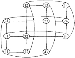 一個(gè)排列圖實(shí)例A4,2的拓?fù)浣Y(jié)構(gòu)如圖2所示。排列圖An,2僅能容納n(n-1)個(gè)主機(jī)。為使系統(tǒng)可容納任意多主機(jī),可將參與主機(jī)組合成多個(gè)An,2結(jié)構(gòu),這些An,2按照樹形結(jié)構(gòu)連接在一起,稱為分層排列圖結(jié)構(gòu)[6]。
