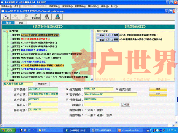 EFE第一步先將所有的窗口、文件與數(shù)據(jù)轉為電子化的檔案,當需要傳送書面文件給客戶時,客服人員可立即在在線點選以傳真或電子郵件將文件傳給客戶(如圖二),傳送成功后并立即以SMS通知客戶。當客戶反饋數(shù)據(jù)回來時,EFE會自動接收并存盤,接收成功后EFE則會立即發(fā)送SMS訊息給客戶安心,而且所有送出與接收文件都有完整記錄可共管理、追蹤與處理。