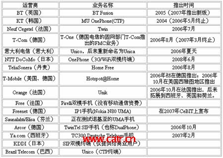 2008年,基于融合性終端的FMC業(yè)務(wù)備受矚目,BT、法國電信、德國電信、NTT DoCoMo等運(yùn)營商利用UMA技術(shù),提供基于WiFi/GSM或者WiFi/WCDMA雙模終端的FMC業(yè)務(wù),市場(chǎng)反映良好,被運(yùn)營商作為未來重點(diǎn)發(fā)展的業(yè)務(wù),預(yù)計(jì)2010年全球FMC用戶將達(dá)到3