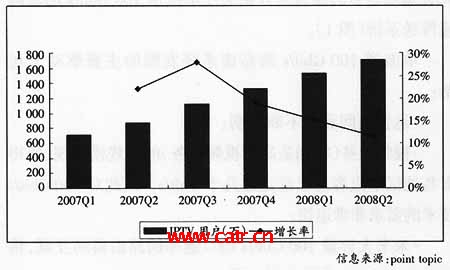 Play業(yè)務(wù),AT&T、Verizon等電信運(yùn)營商也積極開展IPTV業(yè)務(wù),并且用戶規(guī)模迅速增長,截至2008年第二季度,美國的IPTV用戶達(dá)到249萬。亞太各個(gè)國家和地區(qū)的IPTV業(yè)務(wù)發(fā)展情況差異很大,中國香港的PCCW是目前IPTV用戶規(guī)模最大的電信運(yùn)營商,截至2008年第二季度,PCCW的IPTV業(yè)務(wù)“now