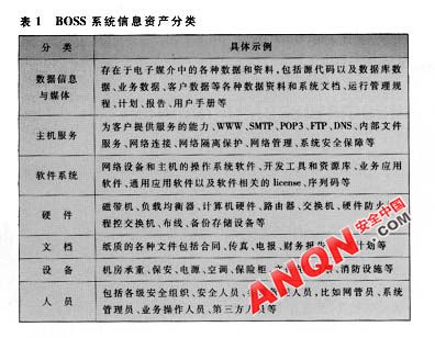 BOSS系統(tǒng)涉及的信息繁多,如何保護關(guān)鍵的數(shù)據(jù)不被泄漏是運營商非常重視的一個問題。信息分級用來評估運營商是否建立了信息資產(chǎn)管理的規(guī)范,明確了信息資產(chǎn)的內(nèi)容和級別,制定了有效的安全保護措施,如果沒有,應(yīng)該明確BOSS系統(tǒng)內(nèi)的關(guān)鍵信息資產(chǎn)并列出清單,依據(jù)國家保密級別制定科學的信息資產(chǎn)分級標準,并作為風險評估的依據(jù)。參照國際信息系統(tǒng)安全標準BS7799/ISO17799對信息資產(chǎn)的描述和定義,可以將BOSS系統(tǒng)信息資產(chǎn)按照表1的方法進行分類。