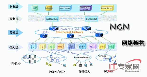 工業(yè)和信息化部電信研究院院長楊澤民也表達(dá)了同樣的觀點。“自NGN出現(xiàn)以來,其定義和重點在不斷變遷。過去,NGN的重點一直是軟交換和IMS,但現(xiàn)在,NGN的定義越來越寬泛,幾乎所有面向未來的組網(wǎng)技術(shù)都可以稱作NGN,VDSL/VDSL2、PON等寬帶接人技術(shù),WiFi、WiMAX等寬帶無線技術(shù)、支持FMC的各種技術(shù)、運營商級以太網(wǎng)、家庭網(wǎng)絡(luò)技術(shù)等等都可以歸為NGN的范疇!彼f。