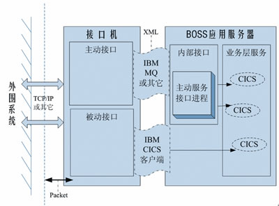 由圖1可知,從調(diào)用方向的角度看,接口可分為主動(dòng)接口和被動(dòng)接口,分別表示BOSS調(diào)用外圍系統(tǒng)服務(wù),以及外圍系統(tǒng)調(diào)用BOSS服務(wù)。主動(dòng)接口由BOSS應(yīng)用服務(wù)器驅(qū)動(dòng),即BOSS應(yīng)用服務(wù)器上的主動(dòng)服務(wù)接口進(jìn)程,是調(diào)用CICS對(duì)相關(guān)待處理表進(jìn)行輪詢,并將每一條記錄封裝為一條消息放入MQ隊(duì)列(該隊(duì)列均由消息組成),接口機(jī)上的主動(dòng)接口再?gòu)年?duì)列中取出消息進(jìn)行解析,進(jìn)而根據(jù)控制信息發(fā)送到指定系統(tǒng)執(zhí)行。被動(dòng)接口則是由外圍系統(tǒng)驅(qū)動(dòng),通過接口機(jī)上的CICS客戶端調(diào)用BOSS應(yīng)用服務(wù)器上的業(yè)務(wù)層服務(wù)操作數(shù)據(jù)庫(kù)。