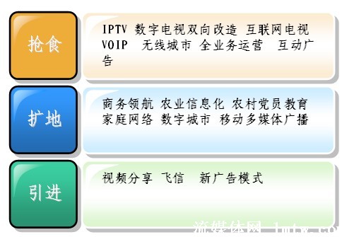 從廣義上講,廣電、電信、互聯(lián)網(wǎng)都屬于信息行業(yè),現(xiàn)在都面臨著自己在增長中遇到的問題,也就是滯漲。滯漲逼迫大家必須去轉(zhuǎn)型,轉(zhuǎn)型現(xiàn)在有三種方式,一個是搶,一個是擴,一個是引進。從最近會議上來看,目前大家對搶食比較感興趣,畢竟有現(xiàn)成的一碗紅燒肉已經(jīng)做好了,對后面兩個,相對來說談得還比較少,因為后面兩個,需要引入一些創(chuàng)新的技術(shù),引入創(chuàng)新的思維。