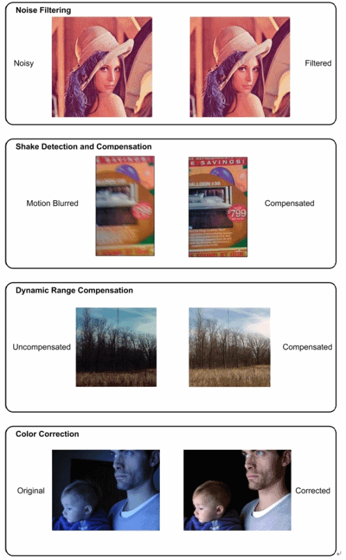 圖: 四種預(yù)處理算法示例:噪聲濾波、抖動檢測與補(bǔ)償、動態(tài)范圍補(bǔ)償和顏色校正。