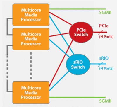 圖3說明,高速串行I/O在復(fù)雜視頻處理任務(wù)中的潛在應(yīng)用。圖中顯示用于擴(kuò)展多個(gè)器件中多核器件處理能力的連接方案,其可以實(shí)現(xiàn)更復(fù)雜的視頻處理運(yùn)算或支持更多視頻轉(zhuǎn)碼通道。采用sRIO開關(guān)能夠?qū)崿F(xiàn)更靈活的器件間通信,不過如果處理流處于相鄰器件之間,也可以不采用這種開關(guān)。與PCIe開關(guān)相比,sRIO由于其數(shù)據(jù)包開銷較低,因此一般成本更低、性能更高、且時(shí)延更短。