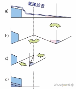 從圖5可以看出重建濾波器的作用,利用參考書中提供的定理可以很容易理解頻譜混疊。通常,在頻域,頻率和放大倍數(shù)都采用對數(shù)刻度,重建濾波器的頻響特性表現(xiàn)為平滑曲線。然而,為了說明邊帶重疊的位置,我們用線性坐標(biāo)表示頻率和放大倍數(shù)。為了表示低通濾波器在同樣刻度坐標(biāo)下的衰減特性,從濾波器頻響曲線可以看出:對于有用的視頻信號衰減很少,對于鏡像頻率衰減較大。圖5b和5c顯示了混疊效應(yīng),但是應(yīng)該注意到,與圖3d相比,圖5d中的鏡像頻率被顯著衰減。