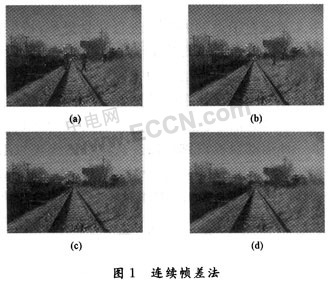 綜合考慮以上四種背景提取方法,本文采用結(jié)合多幀圖像平均法和連續(xù)幀差法這兩種方法來進(jìn)行視頻序列背景的提取?紤]到運動目標(biāo)的多樣性,有目標(biāo)經(jīng)過視場而引起的變化長時間內(nèi)可忽略不計。多幀圖像平均法時將運動目標(biāo)看作為噪聲,用累加平均的方法消除噪聲,利用目標(biāo)運行一段時間的序列圖像進(jìn)行平均而得到視場背景圖像。連續(xù)幀差算法是通過當(dāng)前幀的圖像與前一幀圖像的差值找到運動區(qū)域,對運動區(qū)域的背景保持不變,而非運動區(qū)域的背景則用當(dāng)前幀進(jìn)行更新,經(jīng)過一段時間的迭代便可提取出背景。兩種方法的結(jié)合可以很好地彌補(bǔ)各自的缺點,能夠適應(yīng)鐵路沿線周邊環(huán)境的要求,對存在運動目標(biāo)的背景能夠提取出質(zhì)量較高的背景圖像。具體過程如下:
