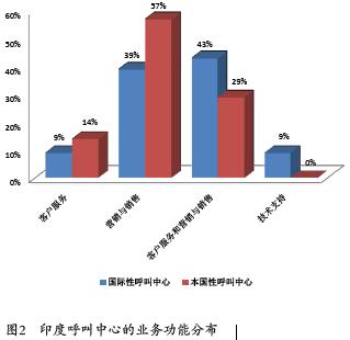 從業(yè)務功能看,國際性呼叫中心和本國性呼叫中心承擔著不同的工作。9%的國際性呼叫中心和14%的本國性呼叫中心提供僅限于客戶的服務,如賬號查詢、催費收款;39%的國際性呼叫中心和57%的本國性呼叫中心專門開展網(wǎng)上營銷與銷售(外撥為主);43%的國際性呼叫中心和29%的本國性呼叫中心同時承擔客戶服務和營銷與銷售功能。此外,9%的國際性呼叫中心專門從事技術支持工作(見圖2)。