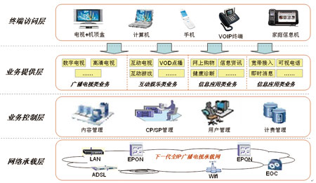 目前用戶是通過電視+機(jī)頂盒的方式享受廣電運(yùn)營商提供的數(shù)字電視服務(wù),而未來用戶可通過計(jì)算機(jī)、手機(jī)、VOIP終端、家庭信息機(jī)等多樣化的終端訪問廣電運(yùn)營商所提供的寬帶接入服務(wù)、VOIP的語音服務(wù)、各種信息化應(yīng)用服務(wù)。