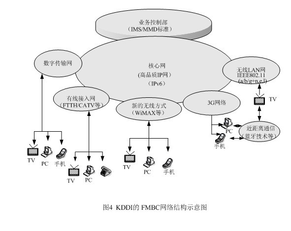 為了在市場(chǎng)競(jìng)爭(zhēng)中立于不敗之地,KDDI另辟稀徑,提出了將固定網(wǎng)、移動(dòng)網(wǎng)、因特網(wǎng)和電視廣播相融合的概念,它與朝日新聞、朝日電視簽署合作框架,就是它的集中代表。FMBC是超3G的構(gòu)想,是以移動(dòng)通信為基礎(chǔ),與固定電話(huà)網(wǎng)及因特網(wǎng)進(jìn)行融合,現(xiàn)在又把廣播電視納入,這樣它就成了KDDI的NGN了。FMBC的網(wǎng)絡(luò)結(jié)構(gòu)請(qǐng)見(jiàn)圖4。從圖4上不難發(fā)現(xiàn)NGN的影子,特別是業(yè)務(wù)控制部的設(shè)立,并采用ISM/MMD標(biāo)準(zhǔn),將網(wǎng)絡(luò)與應(yīng)用分開(kāi),以利新業(yè)務(wù)的開(kāi)拓,同時(shí)完成核心網(wǎng)的IP化,這些都是NGN的基本概念。