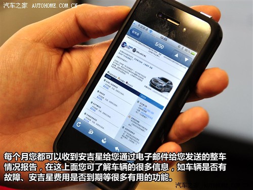 另外,隨著現(xiàn)在手機或者平板電腦的逐步興起,安吉星公司已經(jīng)開發(fā)一套無線端控制程序,您可以在您的手機或者平板電腦上安裝一個程序,之后發(fā)送一個指令短信就可以完成原來需要在車內(nèi)通過人工方式進行的服務(wù)工作。并且未來,安吉星也會增加一些娛樂功能,如訂票或者訂餐業(yè)務(wù)。不過陪同人員也表示:“公司的核心還是以提供車輛安全保證服務(wù),更多增值服務(wù)只要我們想做隨時可以推出。而為車輛提供安全保證這項則是我們的競爭對手還沒有做到的,因此我們要先做好自己的根本工作!