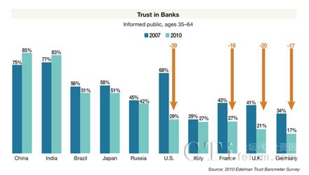 全球經(jīng)濟(jì)的垮臺(tái)在全球范圍內(nèi)嚴(yán)重?fù)p害了人們對(duì)銀行的信任。Edelman的報(bào)告表明自金融危機(jī)以來銀行業(yè)的信任度大幅下降,與之形成鮮明對(duì)比的是其它行業(yè)企業(yè)信任度的提升。