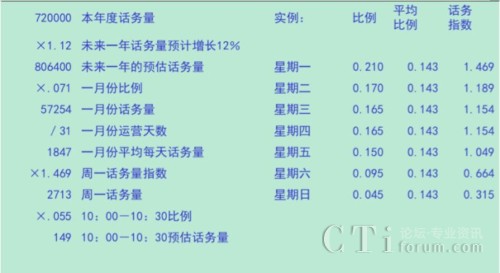 在上圖所示的比例分解過程中,我們假設(shè)去年的總來電量為720000個。在此基礎(chǔ)上,根據(jù)市場、銷售預(yù)測以及過去幾年歷史數(shù)據(jù)增長趨勢等數(shù)據(jù)測算出未來一年的話務(wù)量預(yù)計(jì)增長12%。這樣我們就得到了預(yù)計(jì)未來一年的總來電量為806400個。根據(jù)歷史數(shù)據(jù)的測算分析,一月份的來電量通常占全年總來電量的7.1%,因此明年一月份的來電量預(yù)計(jì)為57254個。由于呼叫中心是7X24小時運(yùn)營的,所以一月份平均每天的來電量為57254/31=1847個。由于大多數(shù)呼叫中心的來電量規(guī)律是以一周為周期循環(huán)波動的,因此我們接下來要測算四個(或五個)周一的話務(wù)指數(shù),以覆蓋四個或五個周一的來電量情況。我們用周一來電量占全周來電量的相對比例除以其七分之一的絕對比例,得出周一的來電量指數(shù)為1.469,也就是說,周一的來電量是相對較多的,相當(dāng)于一周日平均來電量的約147%。由此我們得出周一話務(wù)量為2713個。然后我們再根據(jù)由歷史數(shù)據(jù)測算出的周一一天中48個半小時時段占全天來電量的比例測算出周一上午10:00-10:30的來電量為149個。剩下的周二至周日都可以采用同樣的方法來推算預(yù)測。