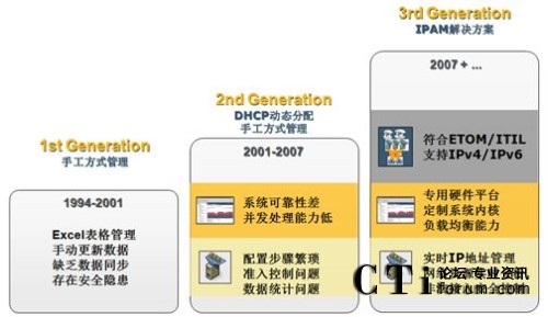 新一代網(wǎng)絡(luò)核心服務(wù)自動化管理支撐平臺能自動、有效地管理訪問網(wǎng)絡(luò)的IP/MAC 資源,實(shí)時(shí)提供更新數(shù)據(jù),控制未授權(quán)IP/MAC地址訪問網(wǎng)絡(luò),從而提高內(nèi)部網(wǎng)絡(luò)的可管理性和安全性。下圖是網(wǎng)絡(luò)核心服務(wù)解決方案的所經(jīng)歷的發(fā)展階段: