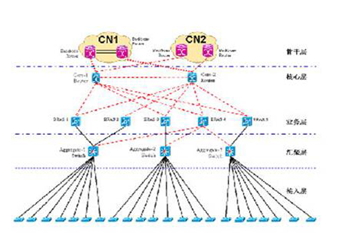 現(xiàn)在中國是世界上最大互聯(lián)網(wǎng)國家,我們國家有著最大的互聯(lián)網(wǎng)使用群體。據(jù)中國互聯(lián)網(wǎng)絡(luò)信息中心(CNNIC)發(fā)布的《第25次中國互聯(lián)網(wǎng)絡(luò)發(fā)展?fàn)顩r統(tǒng)計報告》數(shù)據(jù)顯示,截至2009年12月,我國網(wǎng)民規(guī)模已達3.84億,互聯(lián)網(wǎng)普及率進一步提升,達到28.9%。據(jù)預(yù)測,到2010年底,網(wǎng)民數(shù)量將超過5億。三大運營商在今年的寬帶用戶數(shù)數(shù)量近2億(1)。如此龐大的用戶規(guī)模群體對運營商網(wǎng)絡(luò)是一個嚴峻的考驗,F(xiàn)在的運營商網(wǎng)絡(luò),仍然是接入層,匯聚層和核心層三層架構(gòu)為主體,總的帶寬近40T。以中國電信集團為例,運營商的現(xiàn)有IP骨干網(wǎng)絡(luò)架構(gòu)一般如下圖所示: