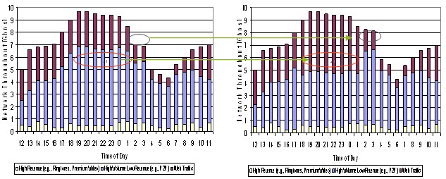 合理調(diào)配資源是指應用智能管道技術(shù),并結(jié)合激勵型市場定價,運營商能夠減少網(wǎng)絡空載時間或降低低載率,在網(wǎng)絡忙時留出更多的資源給高付費用戶和業(yè)務,從而在相同的資源下獲得更高的收益。下圖是某運營商引入智能管道前后的數(shù)據(jù)分布效果圖,忙時高付費業(yè)務增加,非忙時總業(yè)務量增加(主要來自于低付費業(yè)務),這些都為運營商帶來了額外的收入。實際增收效果會因智能管道策略的力度和動態(tài)調(diào)整的效果而有不同,通常都會增加幾個百分點甚至更高。