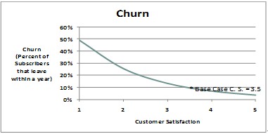部署智能管道可以在網(wǎng)絡容量和業(yè)務保障方面產(chǎn)生積極影響。針對高端用戶提供免溢價的高價值服務/業(yè)務,會提高高端用戶群體的滿意度。高端用戶是高額利潤的保障,是所有運營商爭取的目標,而用戶滿意度是決定他們是否留在網(wǎng)絡的最重要因素。應用智能管道后,預期年離網(wǎng)率將下降1%~2%。離網(wǎng)率的降低,將使用戶平均停留在本網(wǎng)絡的周期加長,從而增加收入并減少新用戶的獲取成本。這一部分的價值和意義,將大于資源合理分配和差異化業(yè)務的價值。下面的圖表顯示了離網(wǎng)率和用戶滿意度的關系。