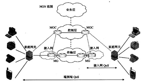 RG也是整個家庭網(wǎng)絡(luò)與外部網(wǎng)絡(luò)聯(lián)系的橋梁,是數(shù)字家庭各種業(yè)務(wù)和應(yīng)用的關(guān)鍵。ITU-T 已經(jīng)將家庭網(wǎng)絡(luò)納入NGN(新一代網(wǎng)絡(luò))的一部分,而RG將在其中扮演重要角色,RG在NGN中的位置及其與外部的連接如圖2所示,MGC為媒體網(wǎng)關(guān)控制器,MG為媒體網(wǎng)關(guān)。