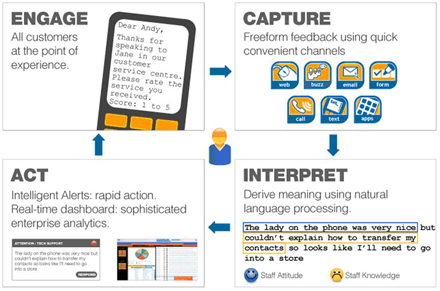 該應(yīng)用軟件能夠捕捉所有聯(lián)絡(luò)渠道上任何形式的客戶反饋;包括文本,郵件,電話,網(wǎng)絡(luò)或者手寫的。然后系統(tǒng)利用先進(jìn)的模式識(shí)別規(guī)則對(duì)客戶反饋進(jìn)行破譯并采取適當(dāng)?shù)男袆?dòng);直接響應(yīng)客戶,將信息轉(zhuǎn)發(fā)給其他更適合響應(yīng)的人并創(chuàng)建實(shí)時(shí)管理信息。
