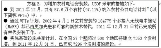 農(nóng)村電話安裝數(shù)從2007年3月的4710萬(wàn)增加到2011年3月的2億8229萬(wàn),2011年12月達(dá)到3億1539萬(wàn)。農(nóng)村電話數(shù)占全國(guó)電話總數(shù)的比例也從2007年的22.88%增加到2011年12月的34.04%。移動(dòng)電話數(shù)量對(duì)農(nóng)村電話總數(shù)的增加貢獻(xiàn)很大。移動(dòng)電話在農(nóng)村電話總數(shù)中的比重從2007年3月的73.33%提高到2011年3月的96.90%,到2011年12月達(dá)到97.53%。2011-2012年(到12月)期間,農(nóng)村電話數(shù)量的增長(zhǎng)率為11.73%,而城市電話用戶增長(zhǎng)率則為8.35%。個(gè)人用戶是農(nóng)村電話數(shù)增加的主要推動(dòng)力,個(gè)人用戶占農(nóng)村電話總數(shù)的比重從2007年的51.87%上升到2011年2月的86.78%。為了增加農(nóng)村電話安裝總數(shù),USOF采取了以下措施,請(qǐng)見方框2所示。