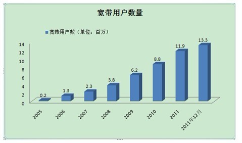 去年進(jìn)行的3G/BWA牌照拍賣有望成為一個(gè)催化劑,將寬帶接入擴(kuò)展到印度最偏遠(yuǎn)的地方。印度電信市場(chǎng)正在經(jīng)歷“信息革命”。為了促進(jìn)寬帶的普及,政府已經(jīng)公布并實(shí)施了多項(xiàng)政策(見方框3)。得益于這些政策的實(shí)施,寬帶用戶數(shù)從2005年的18萬(wàn)增加到2011年3月的1187萬(wàn),2011年底達(dá)到1330萬(wàn)。