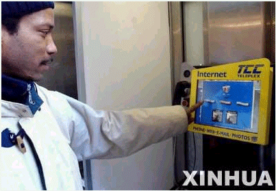 在美國(guó)紐約曼哈頓,一名男子正在使用網(wǎng)絡(luò)公用電話。美國(guó)第一部戶(hù)外網(wǎng)絡(luò)公用電話2月10日在紐約街頭開(kāi)始試用。