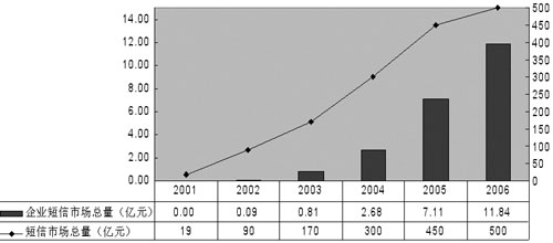 有數(shù)據(jù)顯示,2002年企業(yè)短信市場總量為0.09億元,2003年增長到0.81億元,預(yù)計2006年將突破10億元。終于,中國移動和中國聯(lián)通先后推出了面向企業(yè)用戶的“集團短信”業(yè)務(wù),運營商對這個市場的重視使得一個新的產(chǎn)業(yè)鏈逐步完善起來,短信也開始“潤物細無聲”地改變著國內(nèi)企業(yè)的一些習(xí)慣。