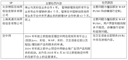 一方面是信息產(chǎn)業(yè)部管理手段的加強,另一方面則是運營商管理方式的嚴肅,從表格中可以看出,中國移動對SP的懲罰已經(jīng)具有相當?shù)牧Χ。在為增殖業(yè)務打造了相關的業(yè)務品牌之后,整個產(chǎn)業(yè)鏈條的控制權目前還是掌握在運營商手中。