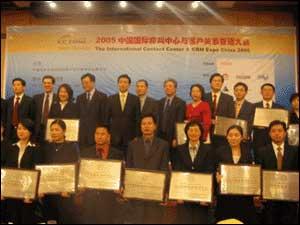 賽迪呼叫執(zhí)行總裁李峻博士榮獲“2005中國(guó)最佳呼叫中心管理人獎(jiǎng)”(第二排左四,代領(lǐng))