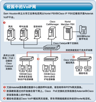 SHSU到目前為止已經將1600 部IP電話由Cisco CallManager遷移到Asterisk上,后者運行IETF標準的SIP。Asterisk的功能將分布在幾臺冗余Dell服務器上:其中兩臺作為冗余PSTN網關;