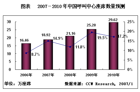 計(jì)世資訊(CCW Research)的研究成果《2006-2007年中國呼叫中心市場研究報(bào)告》預(yù)計(jì),2007-2010年中國呼叫中心的產(chǎn)業(yè)投入規(guī)模平均年度復(fù)合增長率將超過20%,預(yù)計(jì)2007年中國呼叫中心投入規(guī)模將達(dá)到337.19億元,同比增長24.8%。由于2007、2009兩個(gè)年度中國呼叫中心將開始更換新的系統(tǒng)平臺,并開拓遠(yuǎn)程座席市場,因此2007年的呼叫中心座席規(guī)模增長率高于2006年,2009年的呼叫中心座席規(guī)模增長率高于2008年。預(yù)計(jì)2007年中國呼叫中心座席數(shù)量將達(dá)到18.92萬個(gè),同比增長14.9%;而2006年呼叫中心座席數(shù)量的同比增長率僅僅是8.7%,可見2007年的增長率比2006年的高出6.2個(gè)百分點(diǎn)。計(jì)世資訊(CCW Research)研究認(rèn)為,2007年成為中國呼叫中心產(chǎn)業(yè)發(fā)展的轉(zhuǎn)折點(diǎn),2007年中國開始進(jìn)入第二波呼叫中心建設(shè)高潮期。