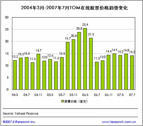 在2006年第二季度總營(yíng)收以及無線互聯(lián)網(wǎng)服務(wù)收入分別達(dá)到歷史最高點(diǎn)(分別達(dá)到5010萬美元和4571萬美元)之后,TOM在線各季收入及無線互聯(lián)網(wǎng)收入呈逐季下滑趨勢(shì),至2007年第二季度,TOM在線的總營(yíng)收為3439萬美元,來自無線互聯(lián)網(wǎng)服務(wù)的收入為3024萬美元!