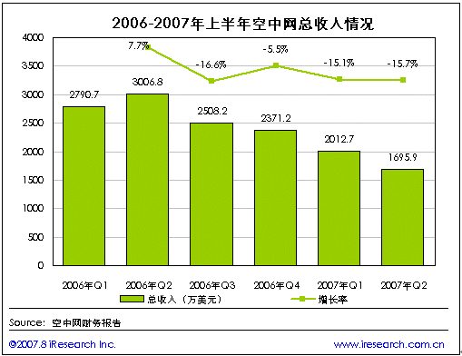 空中網(wǎng)2007年第二季度財(cái)報(bào)數(shù)據(jù)顯示,第二季度空中網(wǎng)的總收入1695.9萬美元,同比負(fù)增長43.6%,環(huán)比負(fù)增長15.7%。與第一季度相比在空中網(wǎng)兩個(gè)產(chǎn)品平臺(tái)的主要2G業(yè)務(wù)和2.5G的業(yè)務(wù)收入都出現(xiàn)了不同程度的下降,但2G業(yè)務(wù)中的IVR業(yè)務(wù)收入則出現(xiàn)了大幅上升。