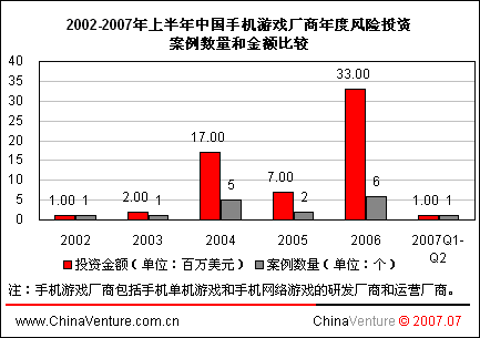 ChinaVenture分析師指出,除2006年觸通安騰和掌上明珠依靠手機網(wǎng)游業(yè)務(wù)獲得數(shù)百萬美元投資外,其余企業(yè)獲融資原因均為投資商看好手機單機游戲業(yè)務(wù)。2007年之前由于手機網(wǎng)游市場規(guī)模過小,加上無線網(wǎng)絡(luò)環(huán)境制約,風險投資商大多抱以觀望態(tài)度。