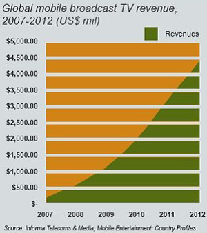 根據(jù)市場研究公司Informa Telecoms &Media的調(diào)查數(shù)據(jù)顯示,移動電視市場在韓國、意大利和美國市場帶動下,將在2007年達到美金2.19億元;至2012年,移動電視市場預計能產(chǎn)生美金44億元的收益,而美國將成為最大的單一市場,占有全球20%的收益。Informa甚至認為在2009年,美國就可超越韓國,成為移動電視最大的單一市場。