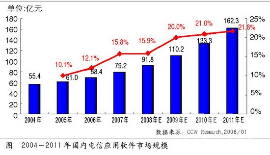 3G是中國未來通信建設的重點。隨著3G發(fā)展趨勢逐漸明朗化,為了有效地對3G網(wǎng)絡進行支撐和管理,針對3G業(yè)務的IT系統(tǒng)建設也逐漸成為運營商信息化的重點建設項目。BSS、OSS和MSS將成為這次建設的主要方向,今后相當長的一段時間內(nèi),計費賬務系統(tǒng)、經(jīng)營分析與決策系統(tǒng)、網(wǎng)絡資源管理系統(tǒng)、客戶關(guān)系管理系統(tǒng)等將成為國內(nèi)電信運營商建設或規(guī)劃的重點。根據(jù)計世資訊調(diào)查顯示,2007~2011年,在3G建設全面展開后,電信應用軟件市場的市場規(guī)模累積將達到將近500億元的市場份額。