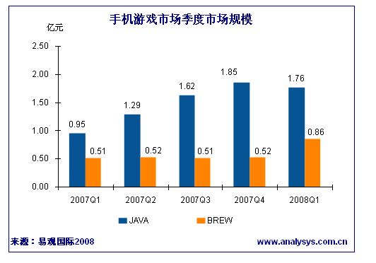 易觀國際研究表明,中國JAVA/BREW手機游戲市場2008年第1季度總體市場規(guī)模達(dá)到2.61億人民幣。其中:中國移動JAVA游戲市場規(guī)模為1.76億人民幣,同比增長85.41%,環(huán)比出現(xiàn)負(fù)增長,一方面由于移動夢網(wǎng)用戶數(shù)減少導(dǎo)致百寶箱用戶數(shù)有所下降,從而影響了游戲下載量,另一方面由于游戲頻道的整合和新游戲運營管理平臺的推出,對受理資質(zhì)、業(yè)務(wù)引入要求、業(yè)務(wù)流程等一系列的修改,導(dǎo)致平臺穩(wěn)定性和用戶習(xí)慣性受到一定影響。中國聯(lián)通BREW游戲市場規(guī)模為0.86億元,同比增長69.30%,環(huán)比增長63.63%,由于春節(jié)的影響,BREW游戲市場規(guī)模大幅增長。
