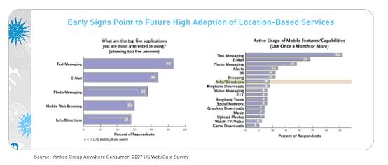 當(dāng)美國聯(lián)邦通信委員會(huì)(FCC)在2001年強(qiáng)制要求實(shí)施911增強(qiáng)功能時(shí),移動(dòng)行業(yè)就開始通過將導(dǎo)航服務(wù)引入大眾市場來獲利。7年后,絕大多數(shù)手機(jī)都集成了GPS功能,幾大主要的移動(dòng)運(yùn)營商也都計(jì)劃在年內(nèi)推出至少一項(xiàng)基于GPS 的導(dǎo)航應(yīng)用。揚(yáng)基集團(tuán)認(rèn)為,2008年正在成為美位置服務(wù)的轉(zhuǎn)折點(diǎn)。