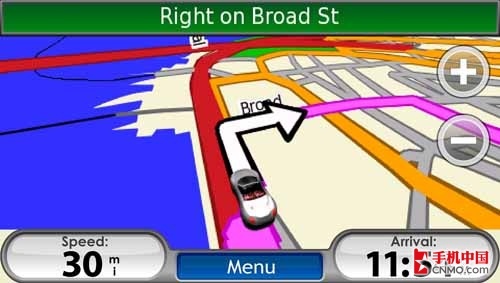 色彩豐富的界面、臨場感十足的導(dǎo)航界面,是Garmin Nuvifon帶給用戶的全新導(dǎo)航體驗(yàn)。用超酷的跑車來表現(xiàn)目前用戶所處的方位,極具創(chuàng)意之余也更加直觀;用戶也可通過觸摸虛擬按鍵來實(shí)現(xiàn)地圖的放大縮小。
